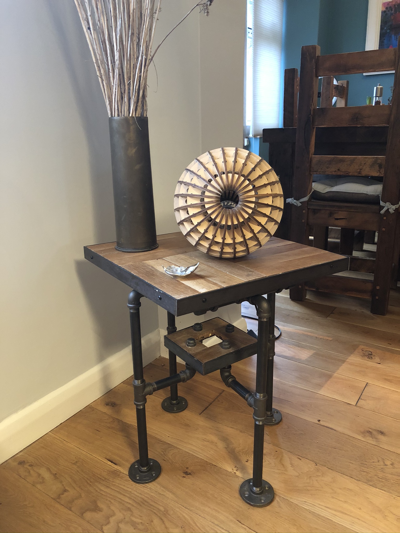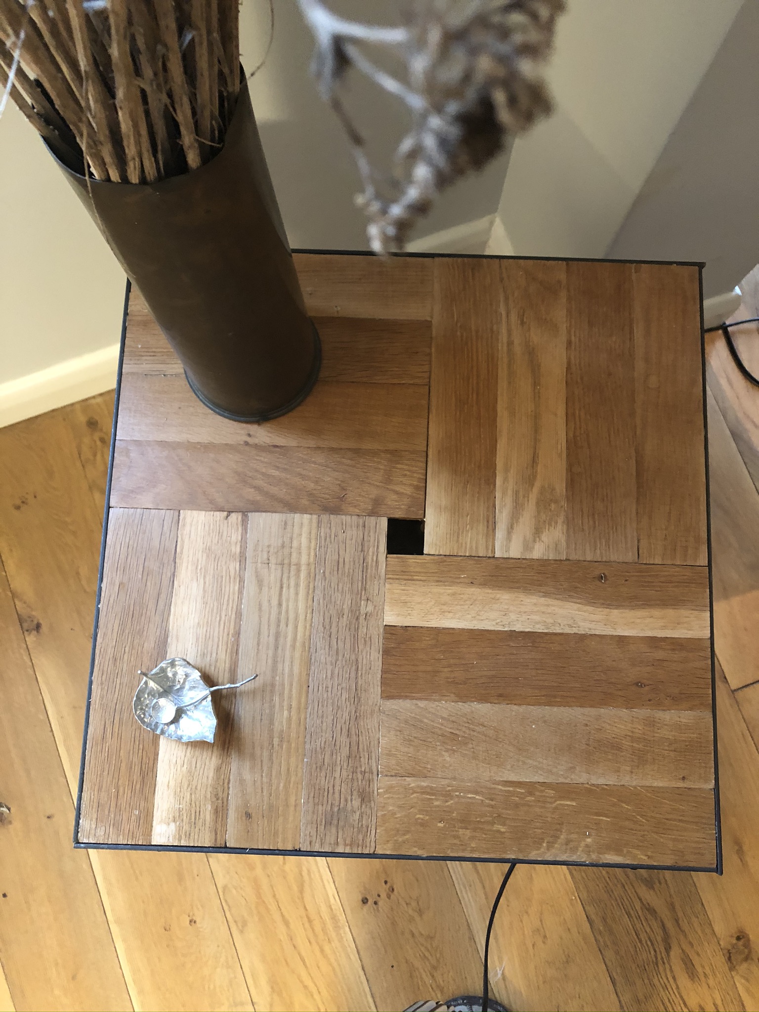 This table is so complex with small parts, steel, parquet flooring and pipe it is beyond an instruction manual. I hope you enjoy looking at it. Its partner may arrive… one of these days.