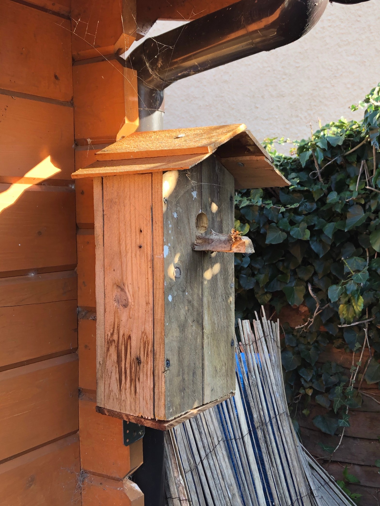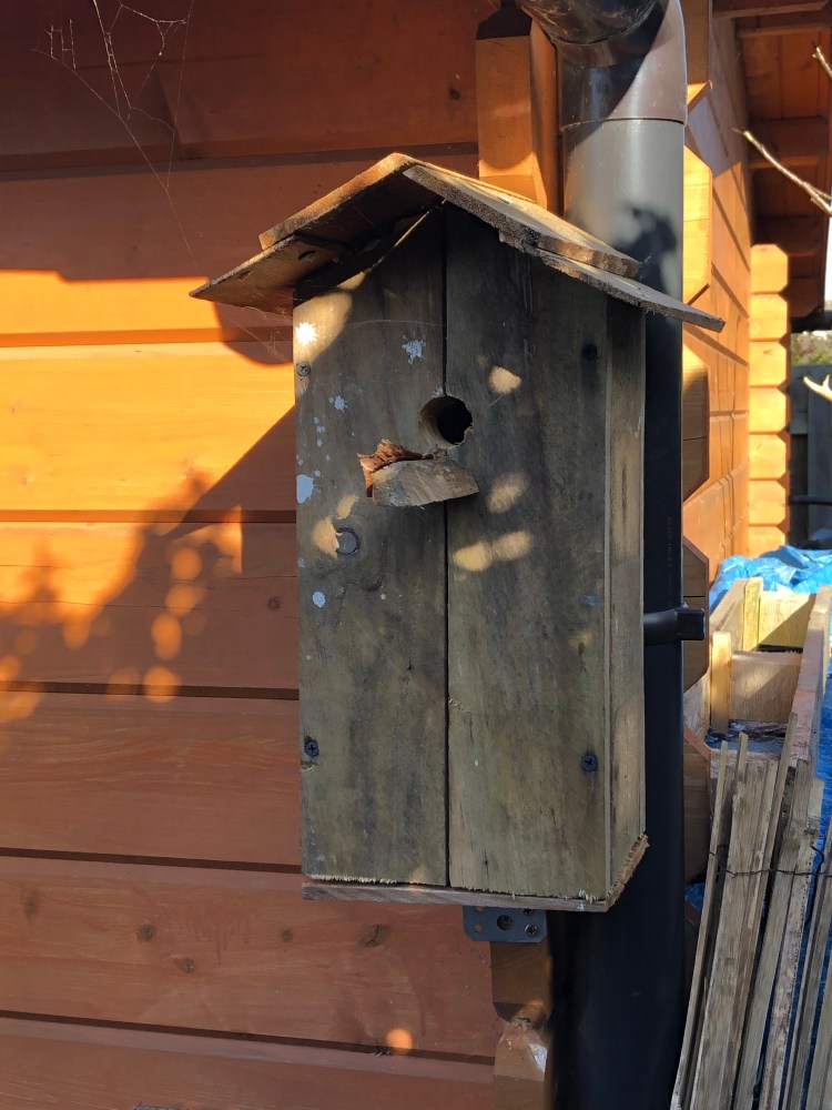 The bird house was a simple design of six small lengths of pallet wood screwed into place. Once the front and back facing pieces had been screwed together, I cut both pieces to a similar angle, I didn’t measure. Then shortened the side pieces to match and screwed the housing together. The bottom and roof were both cedar shingles left over from when I made my greenhouse. The perch was off a picket fence I used on my wheely bin store. No birds have moved in yet!