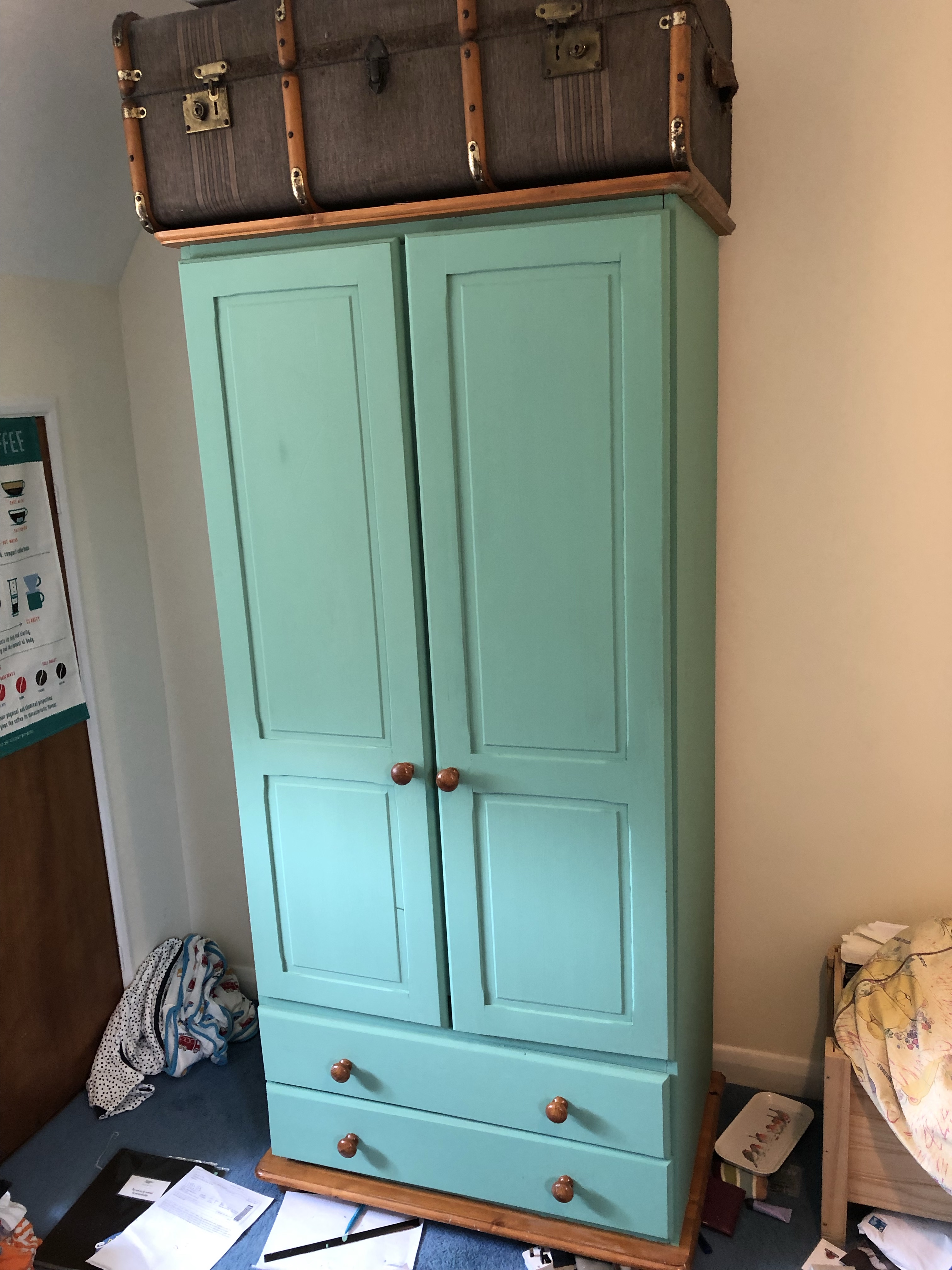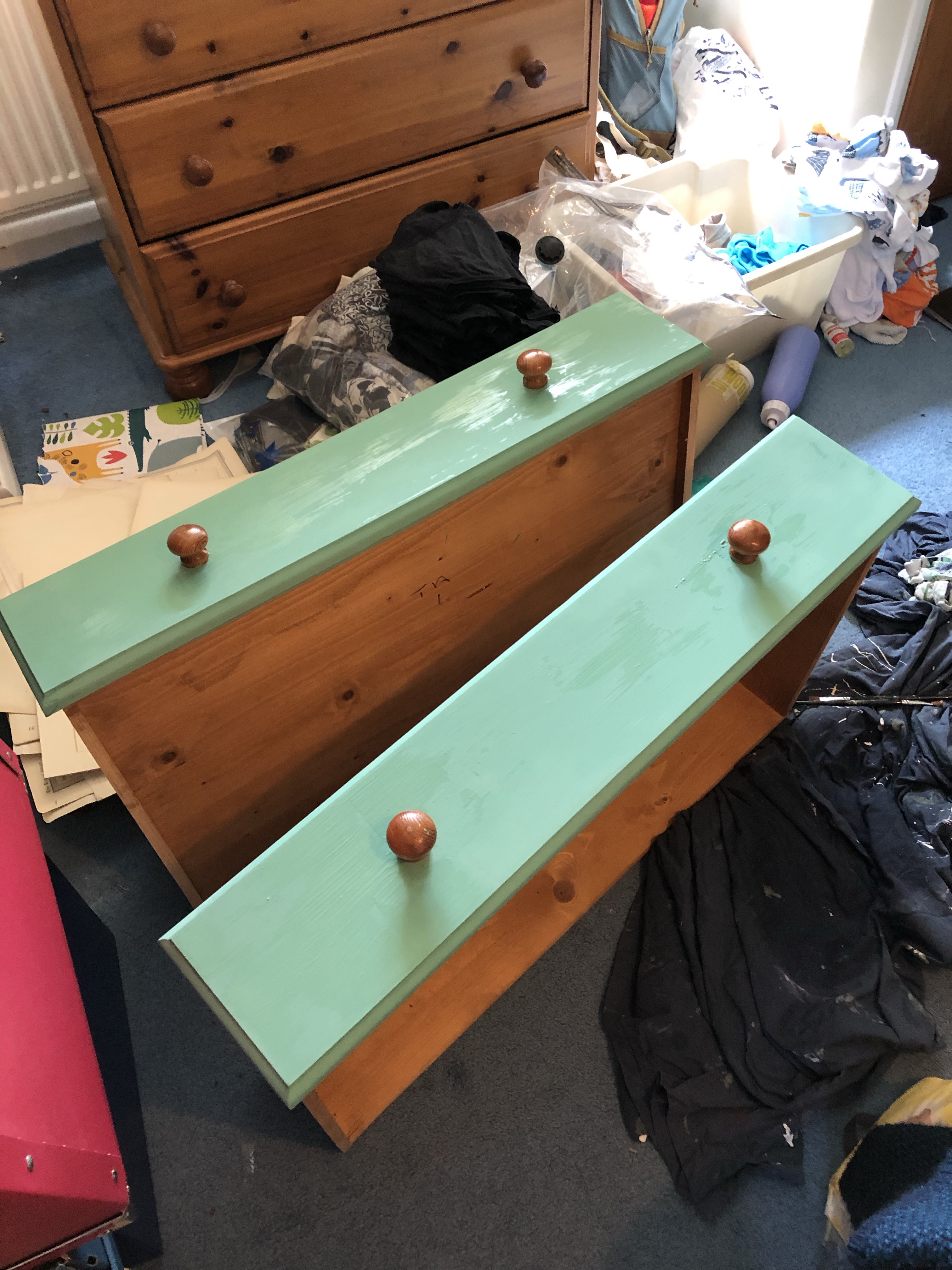 Some pine furniture was handed down several times and been saved, on numerous occasions, from the skip. It is actually quite nice, just a bit boring and dated. Perfect for some upcyling. On this occasion I used green chalk paint, the colour was my own mixture. Looks right.