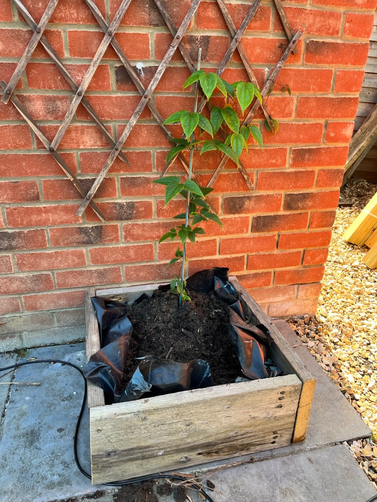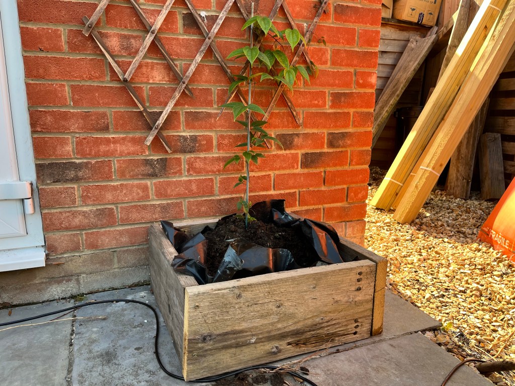 As simple as always. Eight good screws, 4 x 500 cm scaffolding boards, lined with pond liner and treated. Then planted with a climber for our back wall.